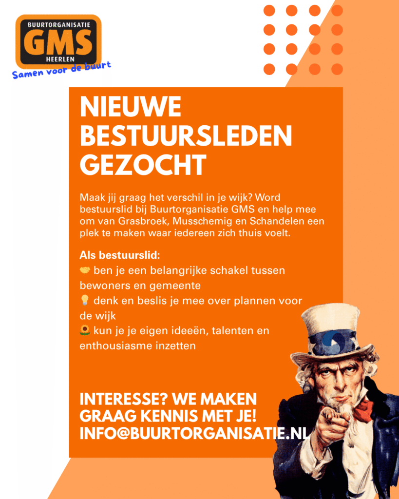 Buurtorganisatie GMS zet zich al jaren in voor een leefbare, gezellige en betrokken wijk. We organiseren activiteiten, ondersteunen buurtinitiatieven en zorgen dat de stem van bewoners gehoord wordt bij de gemeente. Om dat ook in de toekomst te kunnen blijven doen, zoeken we nieuwe bestuursleden – bij voorkeur uit Grasbroek en Schandelen – zodat we de wijk samen eerlijk kunnen vertegenwoordigen.